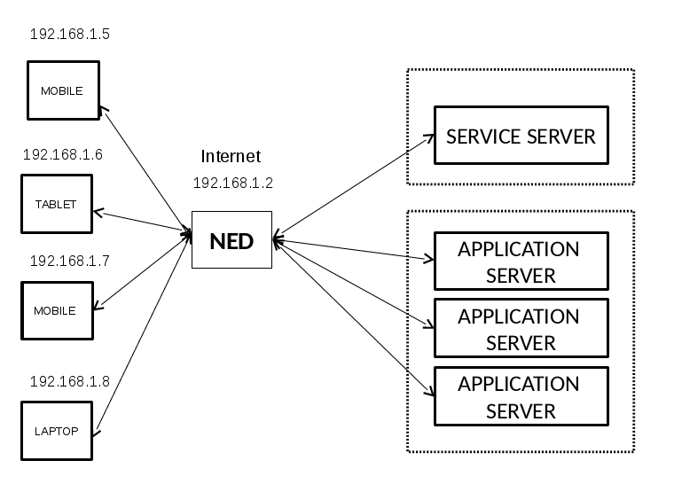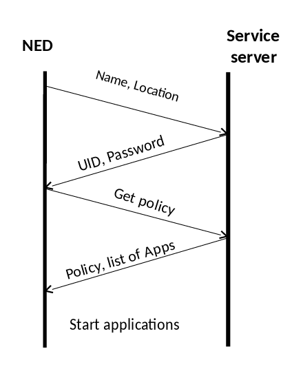 Irrespective of the number and type of the applications running on the NED we need a service entity that is responsible for the administration of the different NEDs running. this will be done by the service server and its device agent running on each NED. the responsibilities of these two entities are: